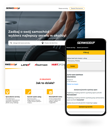 SERWIS500 to w pełni zautomatyzowana, ogólnopolska platforma łącząca właścicieli pojazdów ze sprawdzonymi serwisami wymiany opon oraz warsztatami mechanicznymi. Serwis500 umożliwia montaż opon w wybranym przez siebie serwisie z szerokiej sieci profesjonalnych warsztatów samochodowych.